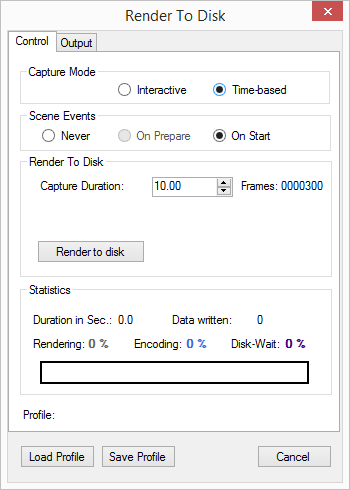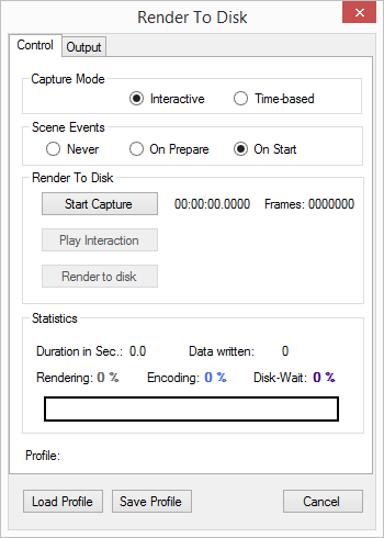 In Interactive mode, the Render To Disk section provides controls to start and stop the recording steps. If user interaction has been recorded, it can be played back by triggering the Play Interaction button. The actual playout to disk is started by pressing the Render to disk button. Note that both buttons are disabled if no recorded data is available.
