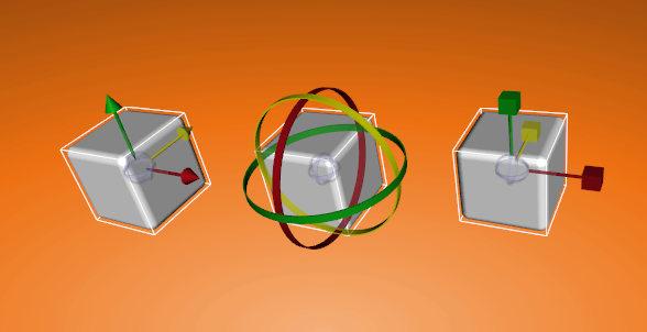 Note: The renderer has to be in Editing mode to show the gizmo. You can either switch between normal run and edit mode by pressing Tab while the renderer has the focus or by pressing the respective button in the renderer toolbar. While in editing mode, an orange selection highlight shows which objects are selected. Also note that during editing mode, no mouse input will be sent to the scene.
