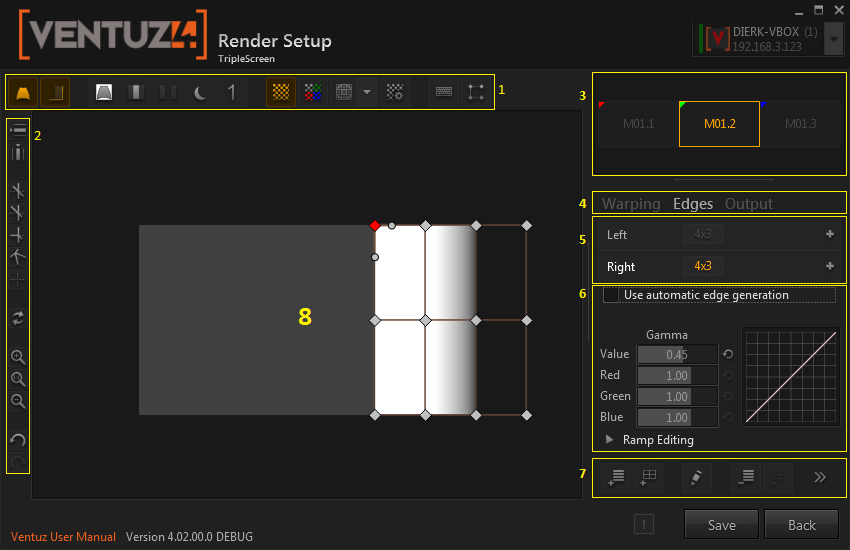 The area marked with (4) can be used to switch between warping and soft-edging The output section contains color correction and other per-output settings.