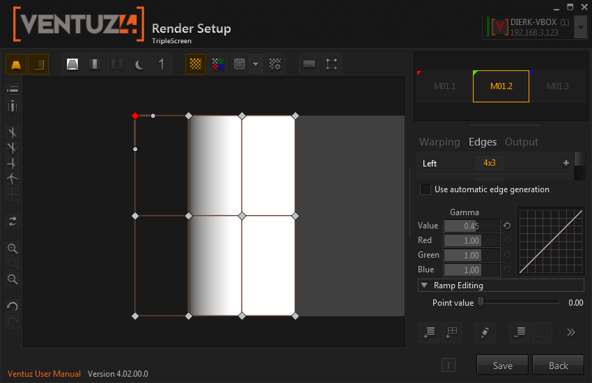 After a Render Setup has been created that defines the placement of the outputs (projectors or displays in a video wall) and the overlap / bezel between them, the Shaping Editor can be used to set up warping and soft-edging. Both Render Setup and Shaping Editor are part of the Ventuz Configuration Editor