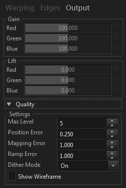 For each output, a simple Color Correction with lift and gain is available. Gain will make the image brighter or darker, without changing the black level. This is done by multiplying the RGB values with the gain. Lift will change the black level. This is done by adding to the RGB values before applying gain.