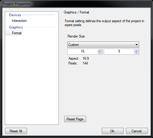 In some cases it might be necessary to change the Project Properties that have been used for the VPR export without re-exporting the whole presentation. This might be necessary for example if the aspect ratio of the display changes. To perform a settings override, click right mouse button on the .vpr file. This brings up the Project Properties editor in a reduced version.