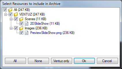 In order to export a Ventuz Presentation, open the main scene in the Ventuz Designer. After a final review of the scene in the Runtime Layout, select File/Export/Presentation (vpr) from the main menu. A resource selection window will request which resources should be included in the VPR file. In most cases, the automatic resource selection does not have to be modified and can simply be confirmed by pressing Ok.