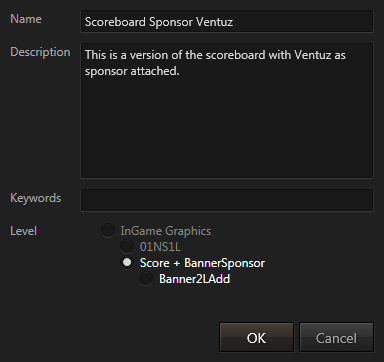 As already mentioned in the chapter on the PropertyEditor, Ventuz Director supports sub-templates - optional add-ons/extensions to templates. Similarly, Pages do not have to contain all the content shown in the Property Editor but can be used to store a sub-part of it. For example, the Hockey demo content contains a sub-template for showing a sponsor logo. By changing the template-level to just the sponsor part, different pre-filled versions of the sponsor template can be created to represent individual sponsors. This allows the operator to cue the main template, modify values and then use a pre-manufactured sub-page for the sponsor!