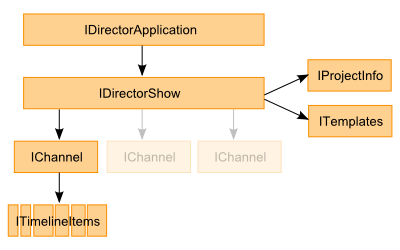 A major portion of a plug-in is of course the interaction of the plug-in with build-in Director functionality like cueing a template or performing a take. As shown in the previous code example, this is achieved via the IDirectorApplication interface that a plug-in is passed as part of the initialize method signature. IDirectorApplication represents the application as a whole and most importantly gives access to the active show in the form of IDirectorShow. The show in turn gives access to the channels in a show, a collection of IChannel instances. The way the interface hierarchy is build directly reflects Director's internal software architecture and should be familiar to anyone who has used Director, although currently only a subset of functionality is exposed.