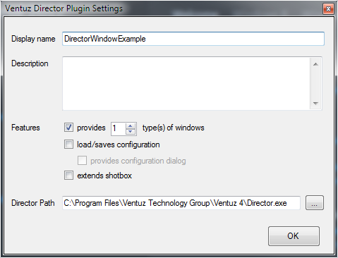 Display name and description of a plug-in are end-user information that will be used inside Director, for example in the plug-in manager. They have no relevance for the functionality of the plug-in but make it easier for an end-user to identify and use a plug-in. The set of controls below is for specifying what capabilities the plug-in will support. For this example, create a plug-in that provides one new window type. Finally, to test a plug-in, a Director instance is required. The extension will auto-detect the latest Ventuz installation and use that application path. If for some reason the auto-detection fails or the plug-in should be developed against a specific Director version, the appropriate Director Path can be entered in the first text box.