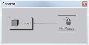Select the Cube again and switch the Property Editor back to inputs. Again, locate the row with the label "X" but now drag the name on to the mouse node. When you release the mouse button over the node, Ventuz will pop up a list of all outputs on the mouse node that are compatible with the input you dragged. Let's say we choose "ClippedX". A black arrow is created between the two nodes in the Content Editor to show the binding. Now move the mouse cursor inside the renderer window and see what happens. The farther the mouse goes to the right boundary, the bigger the cube gets!