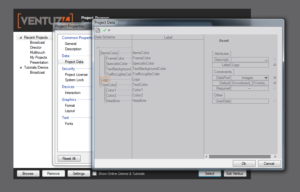 Logo/ColorDefinitions holds seven colors and one logo. So for the colors create data channels of type Color. For the logo choose Asset. Give all channels a proper name and label, and choose default values. For Logo set the DataPool to Images and set the default to ventuz://images/Snowboard_01/ventuz_logo_alpha.tif to have the same logo as used before.