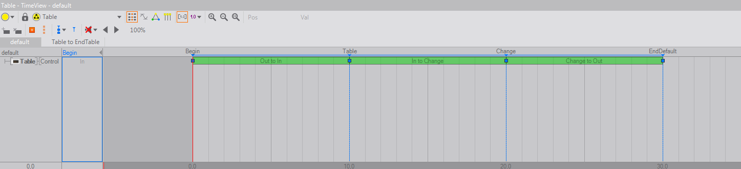 Adding states on the way to the present state leads to a so called Multi-take Template. The path from the normal state called Table to the state called EndTable is for taking the Table off air with a proper animation when not doing all takes of the Template. Of course this path needs to be animated in the Time View like any other. The screenshot shows the different slices.