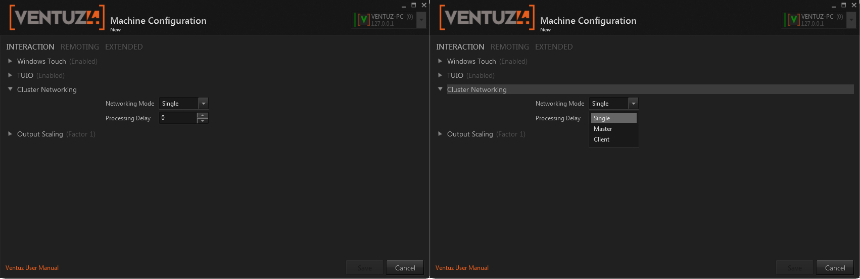 If Single Machine Setup is selected, the event atoms will directly be handed over from the hardware devices to the virtual devices and no network traffic is involved. When a Ventuz scene is running on a cluster of machines, all input devices that are used in the scene should be connected to one machine, the Master. Selecting master in the configuration will cause this machine to serialize the atoms to network packages instead of passing them to the virtual devices by memory. All Client machines on the other hand will ignore all hardware input devices connected to them in the sense that their input will not be received by the respective Ventuz nodes. Instead, they open a network port and list to information coming from the Master machine.
