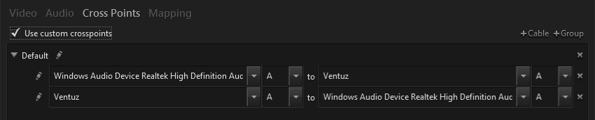 By default the Use custom crosspoints check box is unchecked. In that case Ventuz automatically subsequently connects the first stereo pair of all configured audio and video stream to the Ventuz Record Pairs. And all available audio outputs on all audio and video streams to the Ventuz Playback Pairs. All automatic cables are grouped is a single cable-group called Default. If the Use custom crosspoints is checked that cables have to created manually.