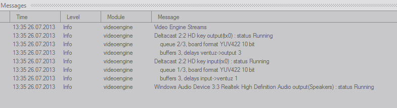The Ventuz Video Engine can mix different boards from different vendors, including Deltacast, Blackmagic and DVS (see Vendors). Video signals can be synchronized to the rendering or asynchronous. For instance, one can use a high quality broadcast board for in- and output of the main video stream and add additional input signals with cheaper hardware.