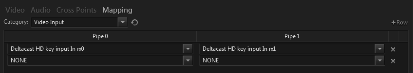 To configure the two output pipes so that each of them has its own live video input as its first device (ordinal 0) use the following mapping. Please note that the second row (ordinal 1) contains a NONE entry for both pipes, because the endless mapping would map ordinal 1 to device 1 if no explicit entry exists for ordinal 1. In this case both pipes would resolve to device 1 (Deltacast HD key input In rx1) on ordinal 1.