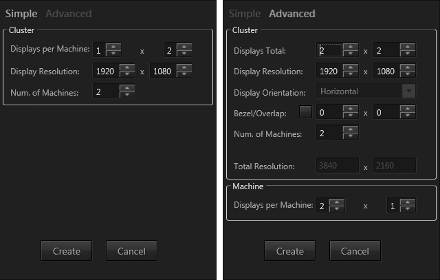 In Simple mode one has to specify the number of displays per machine, their arrangement and the resolution per display. Finally the number of machines has to be given. Clicking Create will arrange the machines from left to right in the Display Editor.