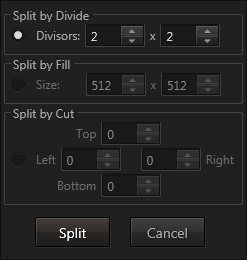 Split by Cut: The selected items are split by performing cuts from left, right, top and bottom according to the specified values. If all four values are larger than zero the split will result in nine items.