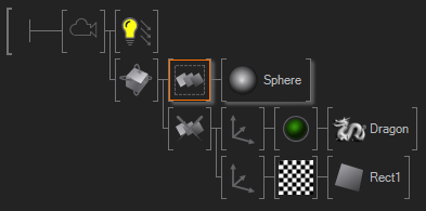 As mentioned on the Multi Touch page, Ventuz's Multi Touch System supports nested gestures. So if we add a Touch Button node right in front of the dragon mesh, the hit testing will ignore the plane but react on the dragon. In fact, the dragon can now be rotated and tapped when hitting the dragon geometry but only rotated when hitting the sphere. This allows for very complex interaction scenarios.