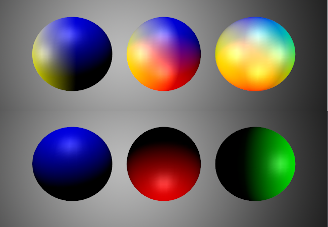 Each light source has an Input Property Index which specifies whether the light should be used in addition to pre-existing lights (Next) or should replace the last activated light (Override). To limit the effect of light sources to certain parts of a scene, Lighting Group nodes can be used. If their Inherit property is deactivated, lights defined outside the lighting group will have no effect on the objects rendered within the lighting group. The example below shows a scene with four differently colored light sources. In the top row, each light source illuminates each sphere that comes after it in the rendering order. In the bottom row, Lighting Groups have been used to isolate each sphere together with one light source in a separate group.