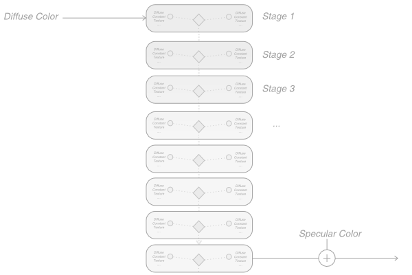 A texture has to be assigned to one of the 8 texture stages via the Stage property. The stages represent the active textures in the render engine. When a fragment is shaded, Ventuz computes the diffuse shading, applies all active textures and then adds the specular information. In increasing order, each texture stage performs one out of multiple possible texture blending functions and then passes the result to the next stage.