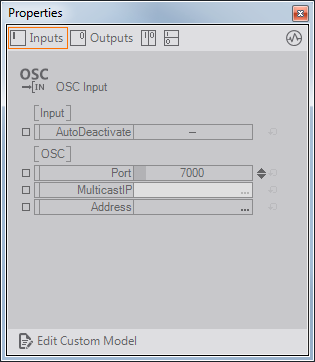 Some Nodes like OSC Input Node or the Script Nodes can have a user-defined number of Properties. The ability to add or remove properties is called a Custom Model. It is usually accessed by a button at the bottom of the Property Editor.