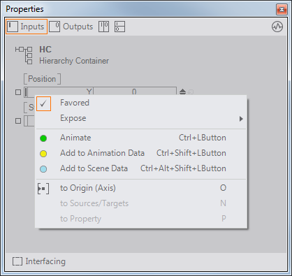 If an input property is bound, the menu entry to Source Node will navigate to the node which is bound to the selected property. The navigation to Property is only possible if the Favored option is enabled. In this case a Hierarchy node inherits the favored input properties of all bound nodes for display in the Property Editor. Selecting to Property on such an inherited property will navigate to the real owner of this property.