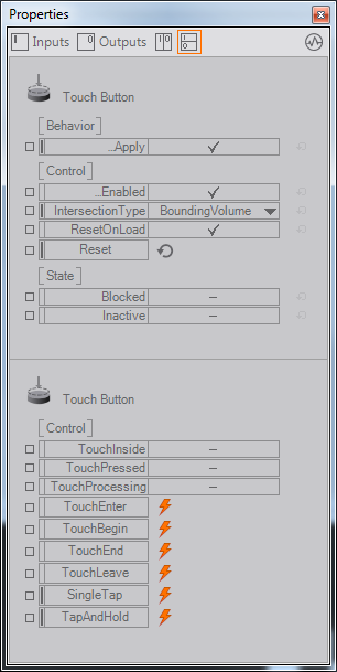 Most properties represent values that influence or are generated by a node. A number of nodes also generate or listen to events that fire when a certain situation arises. The following screenshot of the Touch Button node show both input and output properties and events.