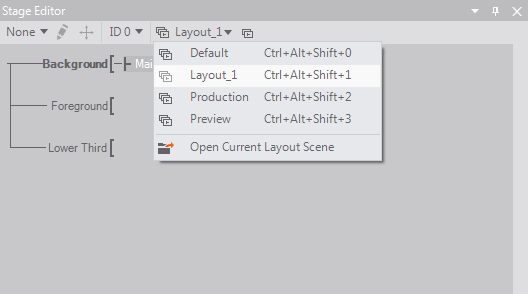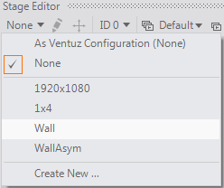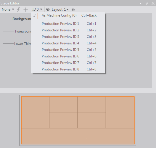Inside the Stage Editor one can switch the Layout to be used by the current project (see below) as well as temporarily change the MachineID for the local machine in order to test cluster setups. The MachineID also influences the Clustermode Preview.