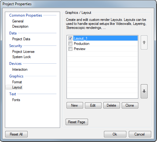 The configuration of Layouts is done in the Project Properties. The Layout section in the Project Properties dialog provides possibilities to create and edit Layouts.