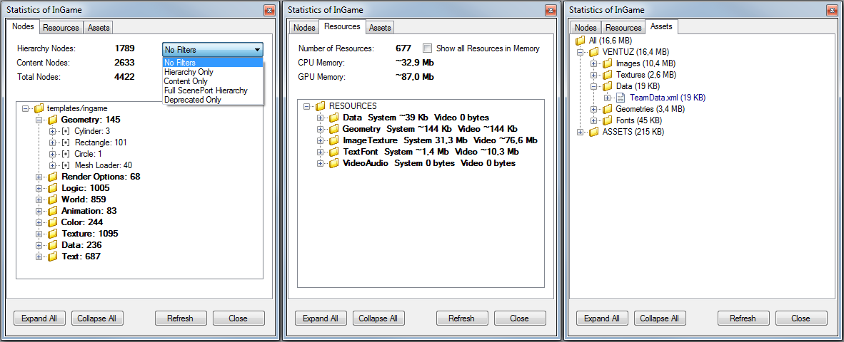 The Assets tab list all assets that are currently load into memory. Every asset lists all those nodes which reference this asset. The assets are sorted according to their data pools in the Project folder.