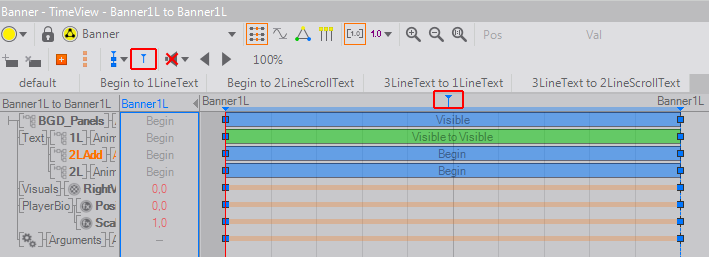 An important key to transitions is the exact point when this data, associated with a template, is passed to the animation node. So, for example, if a self-to-self transition is called, but the data changes, perhaps an animation is desired where the data is changed at a specific moment, but the actual template changes very little. The exact transfer point for the data can be defined in the timeline by positioning a data marker. To place this marker, enter the animation editor window and position the timeline at the point where the data should be transferred, then press M. It will add a small marker at the top of the animation timeline. This marker can be moved, as its properties edited by dragging or selecting it. Multiple markers are allowable, in which case data will be updated on the first marker that is passed and subsequent markers ignored unless the data has changed.