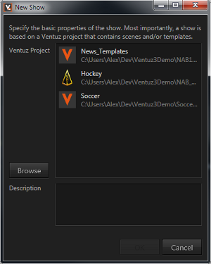 The most fundamental information of a show is the Ventuz Project it is based on. Without a project, a show simply would have no templates that it could use. So when creating a show, the operator is first greeted with a list of recently used projects. If the desired project is not already listed here, use the browse button to locate it and add it to the list.