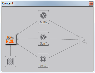 This renders the God Ray light streaks, but not the Lightsource or the Occluders. So add an axis above the Render Target. Move the Lightsource output behind the axis and connect the Axis' position properties to our three floating variables. Now select the Occluder output and press Ctrl+Shift while dragging the Output below the Axis. This will create a node reference.