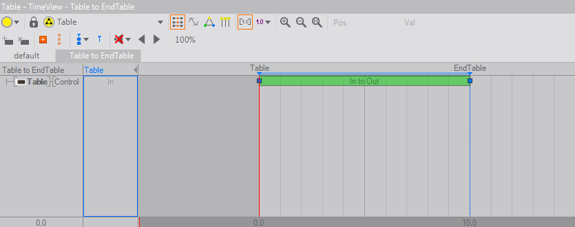 Adding states on the way to the present state leads to a so called Multi-take Template. The path from the normal state called Table to the state called EndTable is for taking the Table off air with a proper animation when not doing all takes of the Template. Of course this path needs to be animated in the Time View like any other. The screenshot shows the different slices.