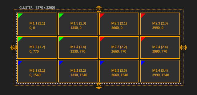 The dashed frame marks the visual border of the whole Cluster or Render Setup respectively. On top of this frame the visual resolution of the Cluster is displayed. (The Cluster always has the default name CLUSTER.)
