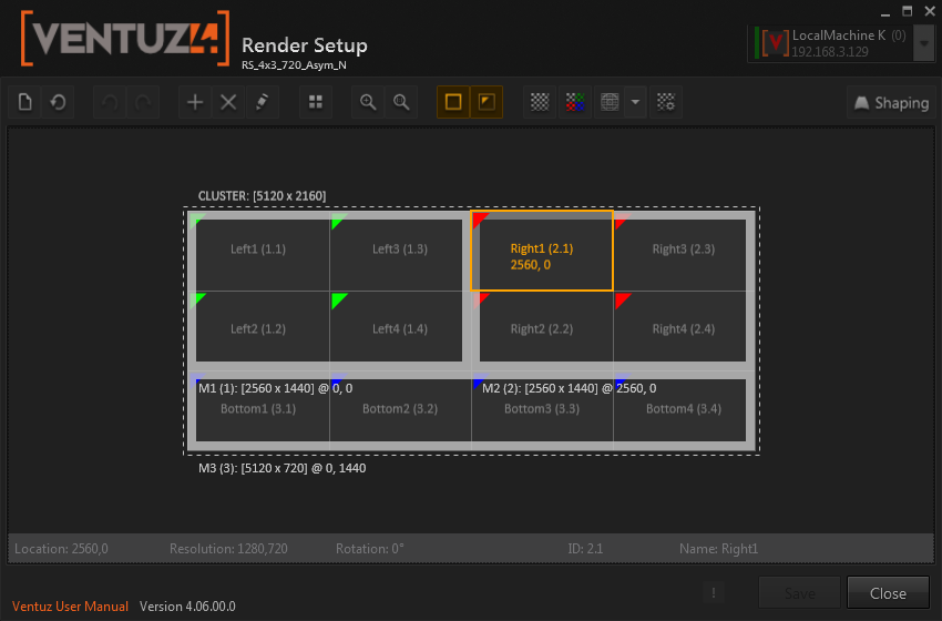 The Render Setup Editor is part of the Ventuz Configuration and is used to create an XML configuration for complex display walls. The content for such display walls may come from a single or from multiple Ventuz machines.