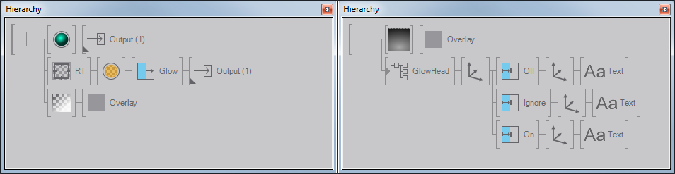 A possible scene setup for such a multi pass rendering is shown in the figure below. The GlowHead container has two linked Outputs: one for the normal pass and one for the glow pass. The normal 'blue' pass is traversed if the Filter Pass node is set to Off or Ignore. The 'yellow' glow pass is traversed if the Filter Pass node is set to On or Ignore.