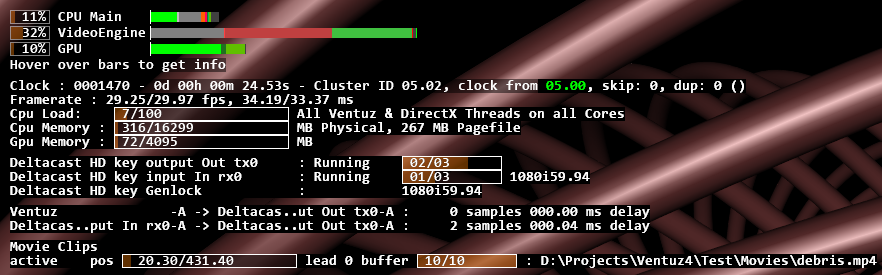 The buffers show how many buffers Ventuz has allocated and how many frames in the future are available. If these buffers run dry, increase the number of buffers for that movie.