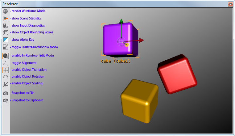 If the In-Renderer Editing is enabled, it is possible to select/move/rotate/scale objects directly in the Renderer window by clicking and dragging the corresponding object handles. Note that in this mode the scene logic does not receive any Mouse and Keyboard events!