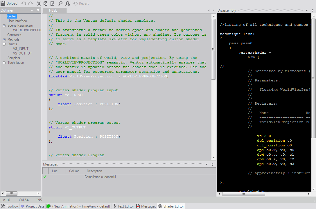 Ventuz supports customized shading of objects via the HLSL Shader Node and the Shader Editor is a dedicated editor for this node. This document discusses the user interface of the editor, for details on developing shader code see here.
