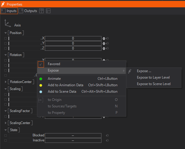 Since Ventuz 5 we introduced a new level in the Scene with Layers. To make exposing a little more handy properties can be exposed to Layer Level or Scene Level directly from the context menu. Pressing the on a category also allows exposing all properties inside that category to a certain level in the scene or to Scene Data to control them from Ventuz Director.