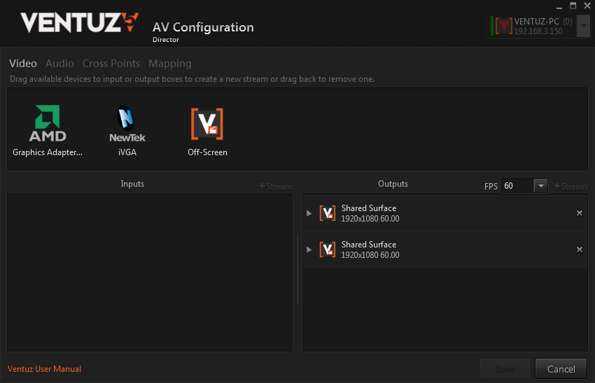 Each channel connects to two so-called pipes provided by the Ventuz Runtime: Program and Preview. Each pipe has an independent output and a template engine that controls the content shown on that pipe. Both can be configured inside the Audio/Video section of the Ventuz Machine Configuration Tool. The Program Pipe usually shows the final result the audience will see. The Preview Pipe is used to provide visual feedback to the operator while he is editing a template.