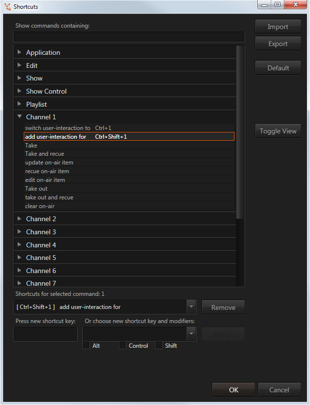 | Ctrl + 1 (...9) | channel | Make channel 1 listen to user operations (take keys, cue, ...) |