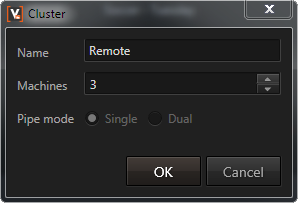 There are various ways to create a cluster: The add cluster button in the topology editor's toolbar, the context menu when clicking on the background of the topology editor, but the quickest is to simply drag a machine from the available machines list to the background of the topology editor. Regardless of which way is used, the cluster edit dialog is opened in which a name can be given, the number of machines in the cluster is specified as well as whether it is a single or dual pipe cluster. The same dialog can be accessed by double-clicking on a cluster's name or via the cluster's context menu.