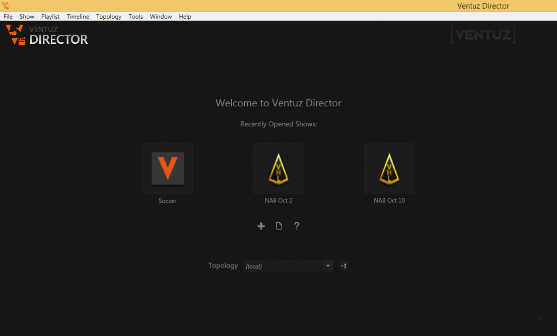 When launching Director or closing the active show, a simple launch screen is shown inside the Director's work area instead of the usual docking environment. In the center, the three last opened shows are shown. Underneath it are buttons to quickly create a new show, browse for an existing one or open the user manual.