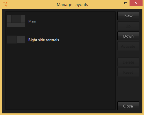 Since layouts are so powerful, Ventuz not only allows for adding and removing windows but also for switching between different layouts. Window layouts are managed via the main menu Window/Window Layout/Manage.... The list shows a thumbnail for each available layout as well as its name.  double-click on the name to edit it. By selecting an entry, the buttons for re-ordering, deleting and resetting to default become enabled. To actually activate a layout and use, press the Activate button.