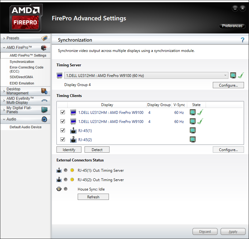 Next, configure the timing master and client in the graphics card driver. See your graphics card manual for details. Below is an example screenshot for a four display machine set up as timing master. Configured in AMD Catalyst Control Center. The timing signal comes from an external sync generator.
