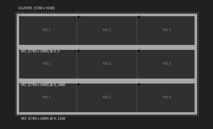 If the machines for the cluster are already available in the network, it is important that they use the same non-zero Group ID and each machine has an ID starting from 1 for the first machine, 2 for the seconds, etc. If the machines use multiple outputs, you have to configure the graphics driver to treat them as one logical output. NVIDIA calls this Mosaic technology, AMD calls it Eyefinity. Log onto those machines and use the appropriate tools of the graphics vendor (e.g. NVIDIA Control Panel or AMD Catalyst Control Center).