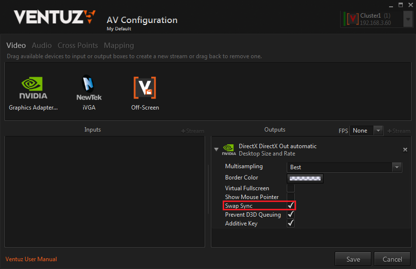 So far we aligned the displays refresh rates to a common time source, be it internal or external, to avoid tearing or flickering. This was done in the graphics card configuration. As described above, Swap Sync requires support by the application - Ventuz in this case. To enable swap sync, move to the DirectX Output of the AV Configuration.