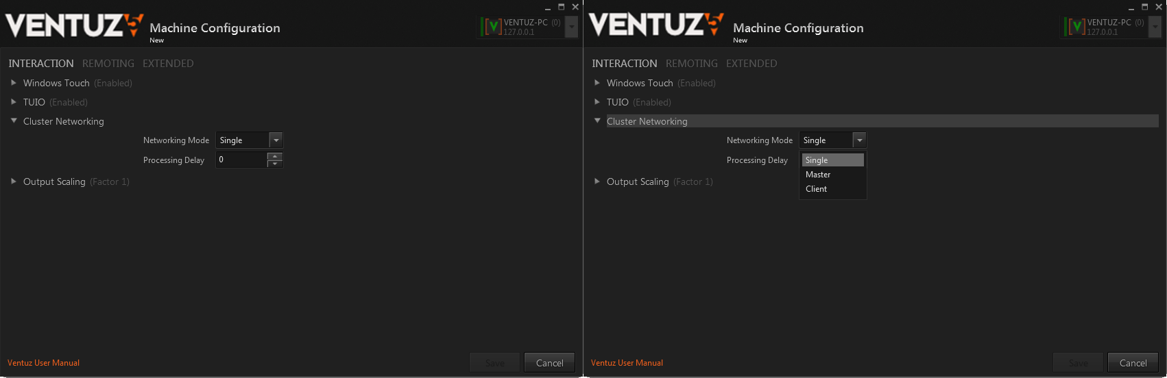 If Single Machine Setup is selected, the event atoms will directly be handed over from the hardware devices to the virtual devices and no network traffic is involved. When a Ventuz scene is running on a cluster of machines, all input devices that are used in the scene should be connected to one machine, the Master. Selecting master in the configuration will cause this machine to serialize the atoms to network packages instead of passing them to the virtual devices by memory. All Client machines on the other hand will ignore all hardware input devices connected to them in the sense that their input will not be received by the respective Ventuz nodes. Instead, they open a network port and list to information coming from the Master machine.