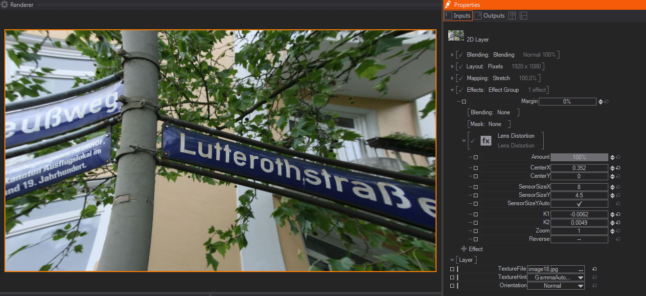 This distortion effect replicates the typical Barrel and Pin Cushion aberrations associated with optical lenses. It is based on the same maths used for Lens calibration in virtual workflows, and therefore it includes controls for the sensor size, zoom and the like. The parameters available are: