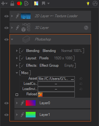 After import the created layers can be edited like any other Texture Layer, and the Photoshop Import Layer like any other Layer Group. Both the PSD Layer Group and the individual layers features thge same properties as any other layer inside Ventuz, they support effects and their layout, blending, etc can be edited like any normal Ventuz layer.